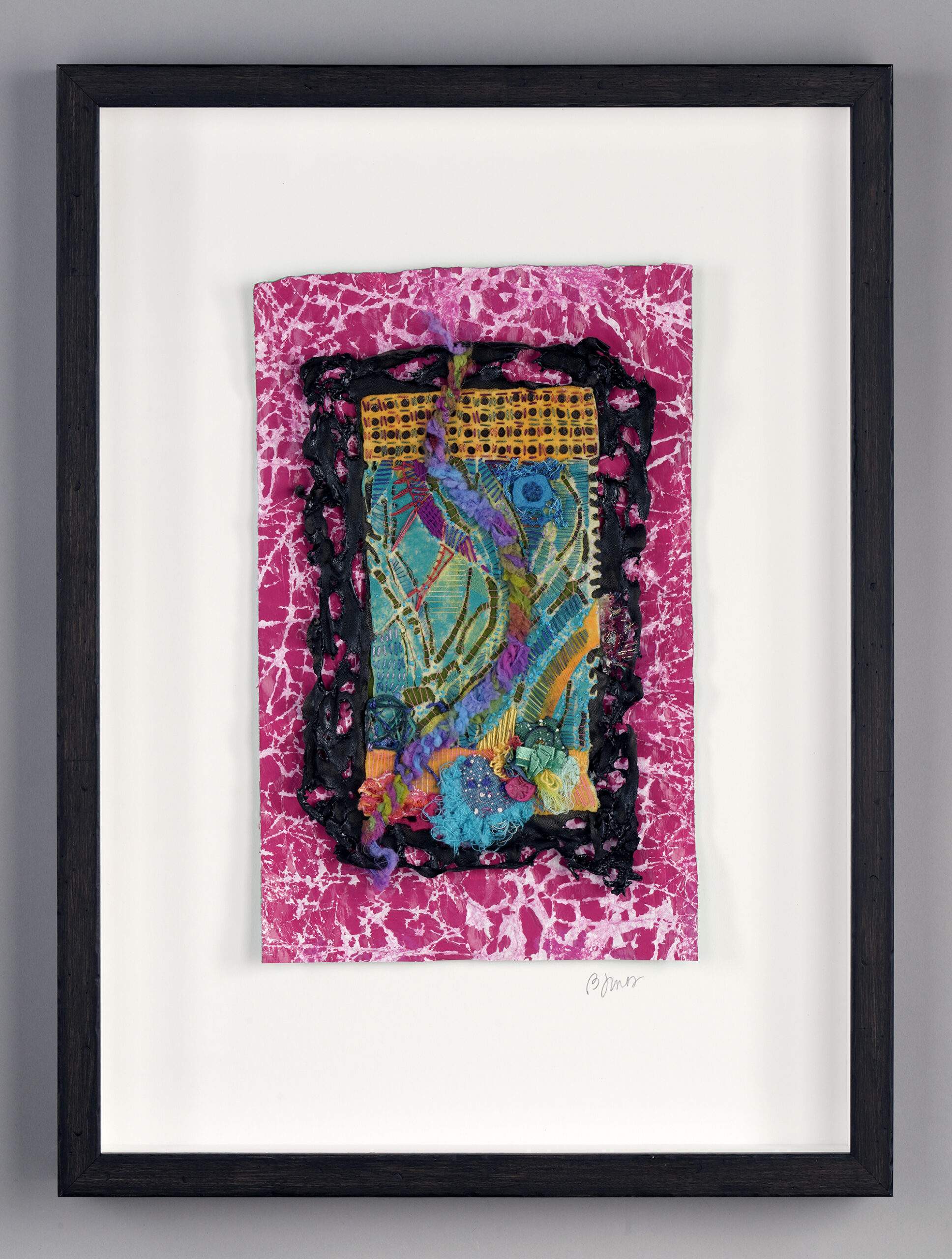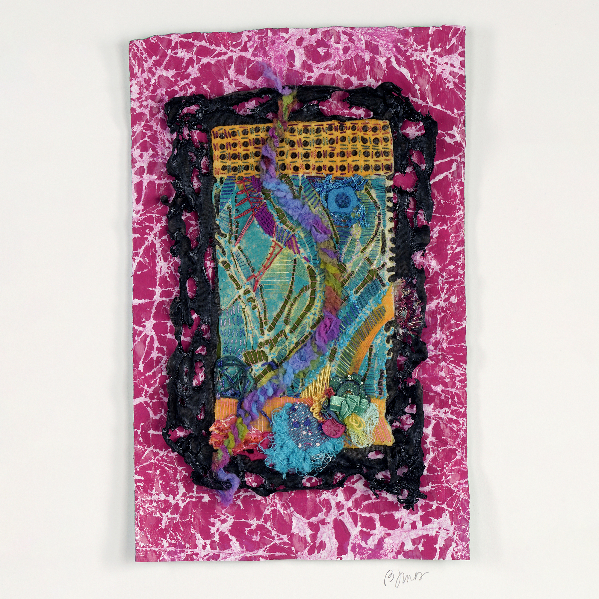 Materials and Tools: Synthetic fabrics, Tyvek, transfer foil, a variety of natural and synthetic threads, synthetic yarn, paint, hand stitching, heat gun, wood burning tool