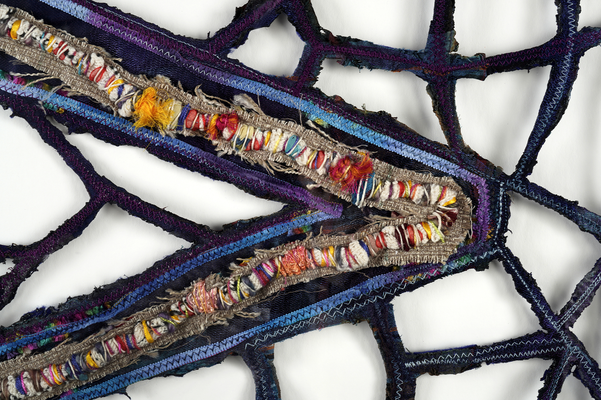 Materials and Tools: Natural and synthetic fabrics, upcycled clothing, ribbon, natural and synthetic yarn, hand and machine stitching, heat gun, wood burning tool