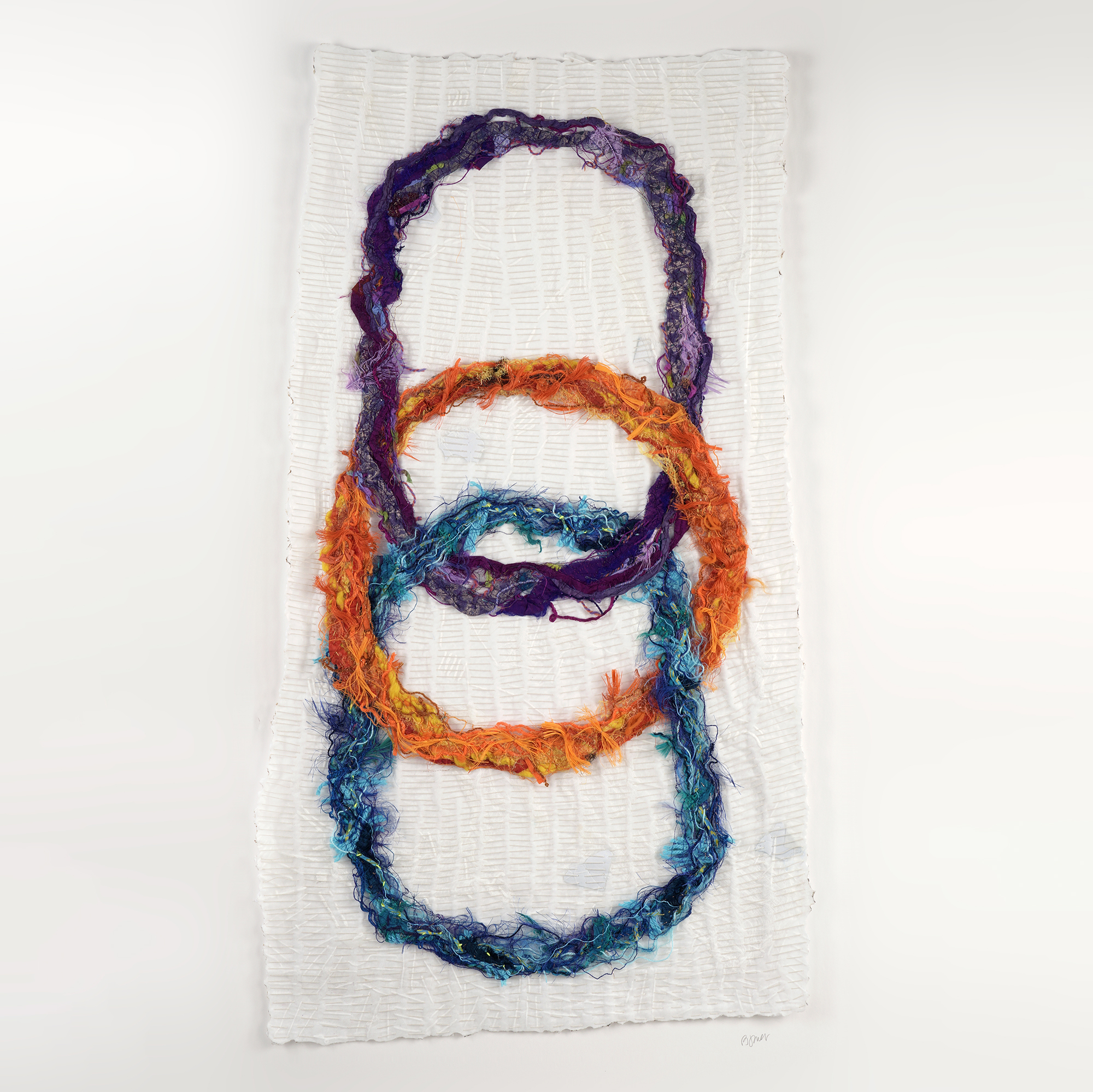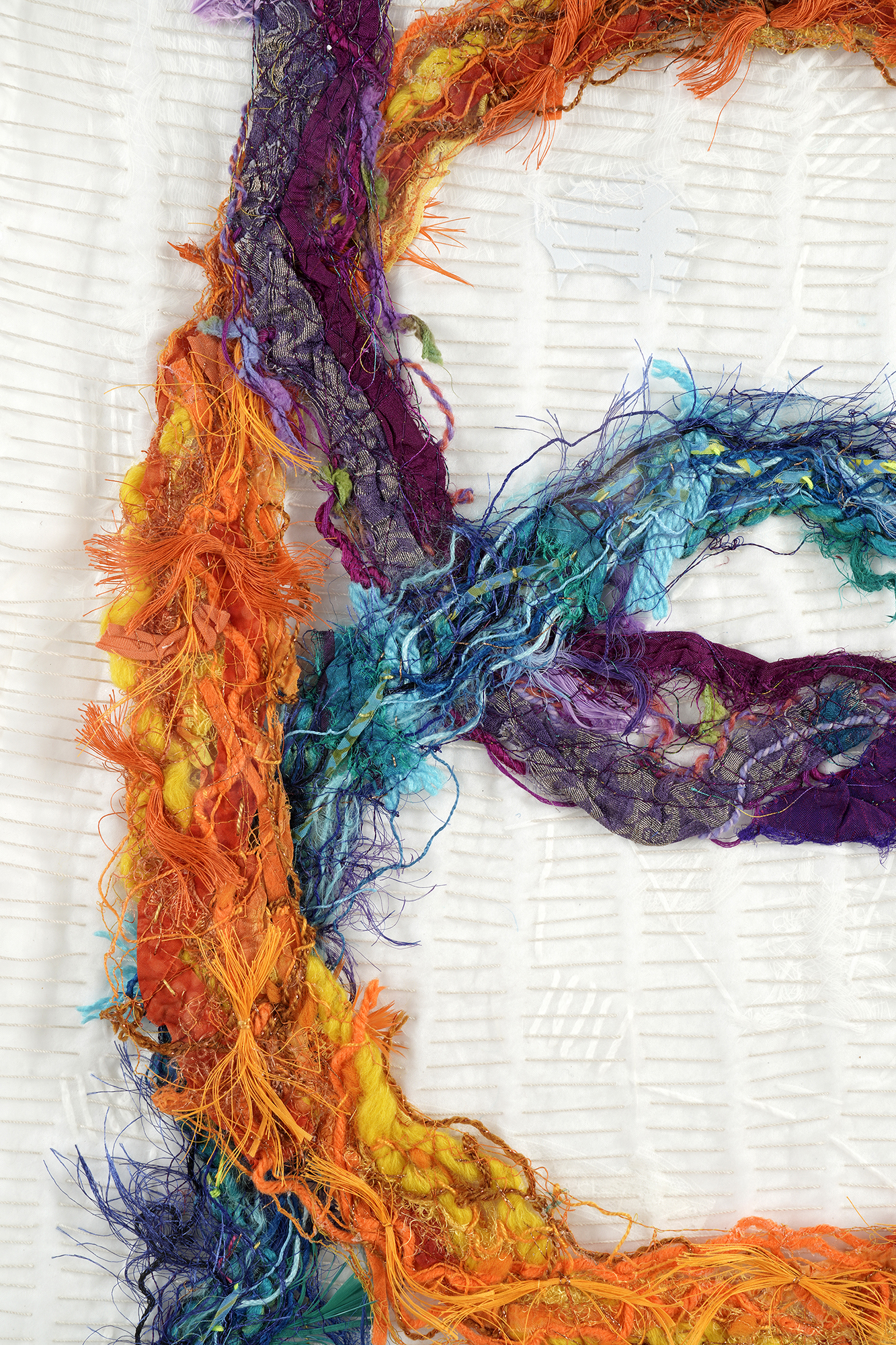 Materials and Tools: Synthetic fabrics, a variety of natural and synthetic threads, hand stitching, wood burning tool