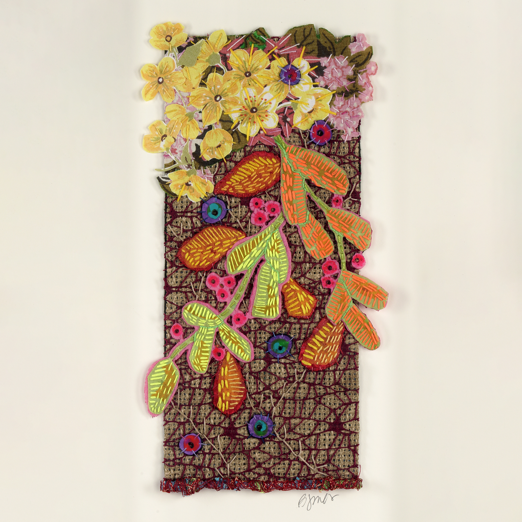 Materials and Tools: Natural and synthetic fabrics, vintage tablecloths, a variety of natural and synthetic threads, paint, wood burning tool